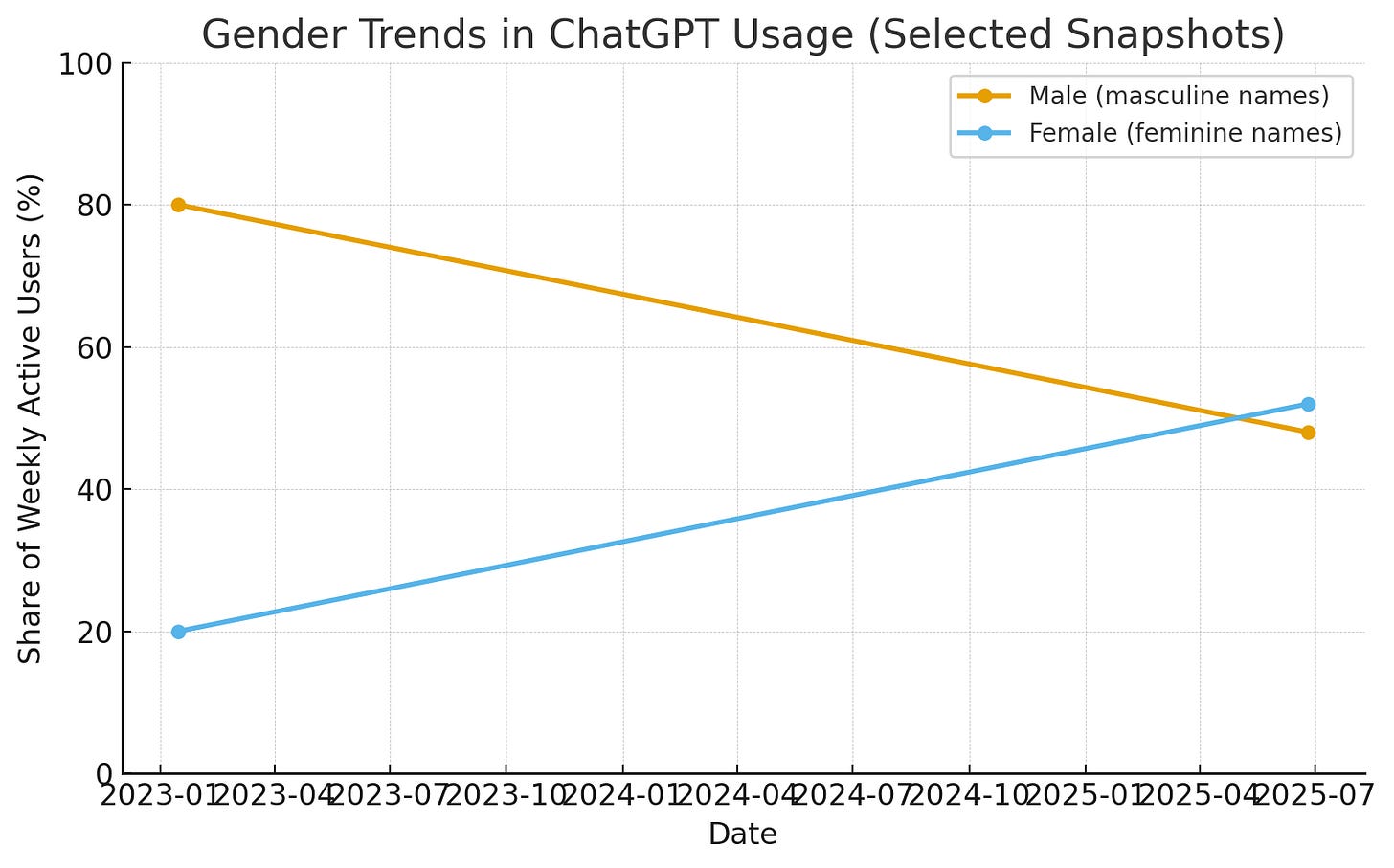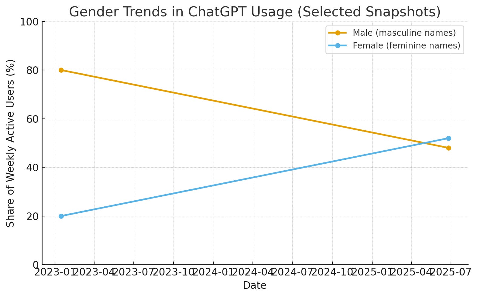 The gender gap has closed: early adopters were 80% male, but by 2025 women slightly outnumber men among active users.